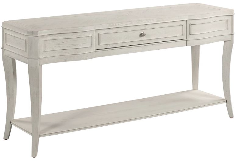 This piece presents a sophisticated look with its serpentine shape and elegant tapered saber legs. It is constructed of cathedral white oak veneers, and the entire piece including the back is finished in an Eggshell color. The console sports one shelf and one drawer for ample storage.Read More