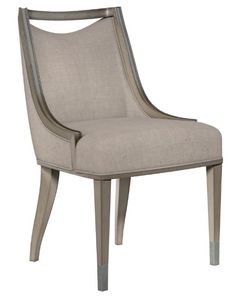 This elegant chair features a curved back frame with a cutout above the upholstered panel, which is upholstered in a stylish, neutral fabric. The wood frame features a dimensional Mica finish, while the front tapered legs are accented with pewter-finished metal ferrules, seamlessly blending style and functionality.Read More