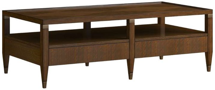 New Traditional Cocktail Table with both clean lines and a dramatic Quartered Walnut top with Diamond Pattern with tapered legs and Burnished Gold finished tapered legs.