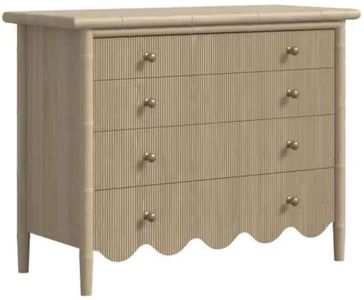 The soft, natural finish evokes the timeless charm of sun bleached wood, while the delicate scalloped apron adds a touch of feminine whimsy. With its four drawers providing ample storage, this bachelor's chest seamlessly blends functionality with the lighthearted, inviting atmosphere that defines the Haven collection. Perfect for adding a touch of enchanting style to any room, be it a bedroom, entryway, or living space.