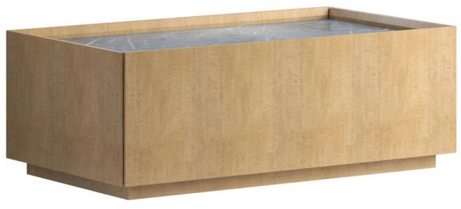 Classic contemporary rectangular cocktail table with integraged, self closing drawers at each end topped with a honed marble top. A Celebration of crisp lines and beveled edges, this collection offers over 20 designs in figured maple veneer, complemented by fabric-wrapped, or organic jute cord accents. Perfect for metro, urban, or contemporary homes.Read More