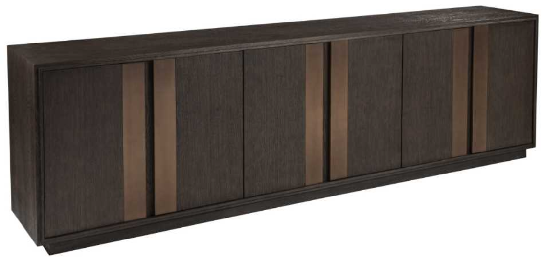 Contemporary designs made from wire brushed quartered white oak veneers and premium hardwoods in a rich, dry brown crafted finish, safeguarded by a protective topcoat, with antiqued brass accents and hardware.