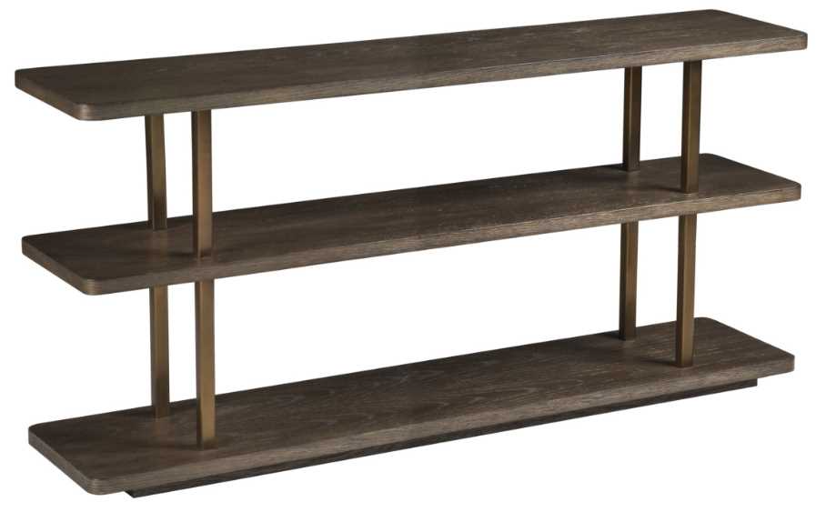 Contemporary designs made from wire brushed quartered white oak veneers and premium hardwoods in a rich, dry brown crafted finish, safeguarded by a protective topcoat, with antiqued brass accents and hardware.