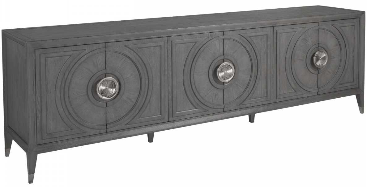 Crafted from flat-cut white oak veneers and select hardwoods in a medium gray wire-brushed finish, with overscaled brushed nickel finished custom hardware. The six doors open to an adjustable shelf and drawer behind each pair, and a ventilated removable back panel for media components.Read More