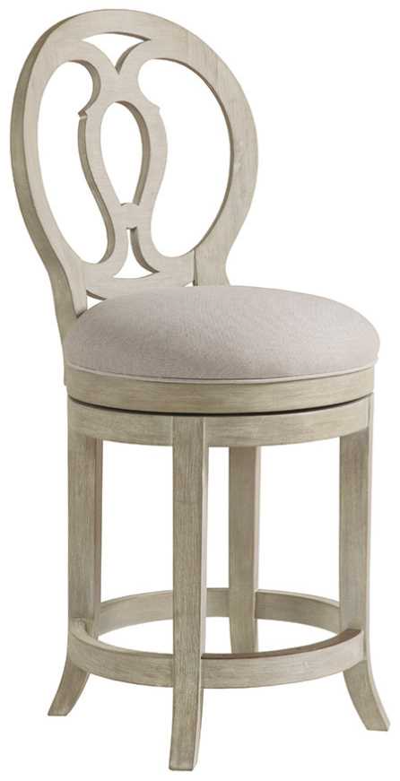 Casual design crafted from Mahogany in the Bianco finish. The wooden oval back stool has an upholstered memory swivel seat available only as shown in a linen and cotton blend with a soft hand in a natural greige coloration, fabric 153671.Read More
