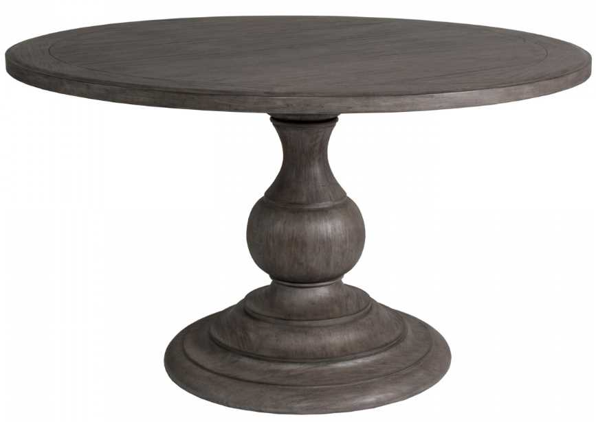 Casual design crafted from Mahogany in the Grigio finish, a warm gray tone with hand wire brushing. The 54-inch round table seats five comfortably, is scored for a plank effect and features an urn shaped pedestal base. Available in all Cohesion finishes.Read More