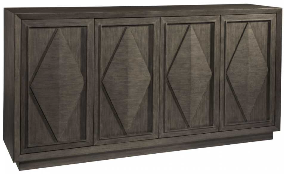 Transitional design in mahogany solids and veneers, and select hardwoods finished in a warm gray tone with wire brushing, our Grigio finish. The four doors have a diamond pattern overlay and are open to two felt-lined drawers (one divided for silver), four adjustable shelves, sliding ventilated back panel for wire management.Read More