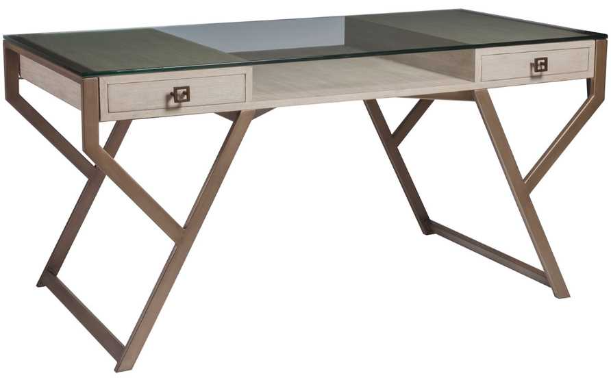 Contemporary writing desk crafted from Mahogany solids and veneers with a warm metallic finished frame and hardware, and a tempered glass top. The Bianco finish is a white wash over wood tone with hand wire brushing.Read More
