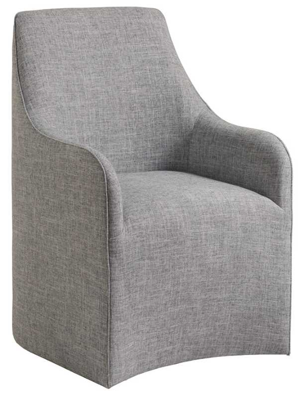 Solid Mahogany arm chair frame, fully upholstered and available as shown in a linen weave fabric with a soft hand in a natural gray coloration, fabric 153713. Casters ensure easy movement.Read More