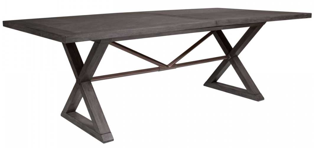 Farmhouse designs crafted from Mahogany veneers and select hardwoods in the Grigio finish, a warm gray tone with hand wire brushing. The finish appears two-toned when light reflects from the solids to veneer. The top features mitered corners with a cathedral pattern veneer top, and a diamond match veneer leaf.Read More