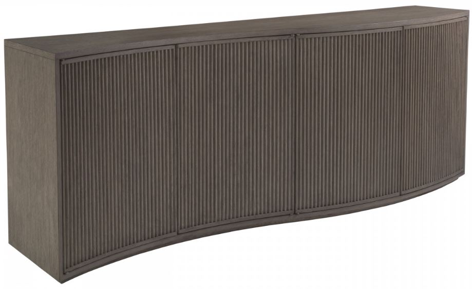 Original modern design featuring an asymmetrical curved footprint dressed with fluted doors in a medium cappuccino gray oak finish on sandblasted quartered white oak. The sculptured body is reminiscent of an ocean wave.Read More