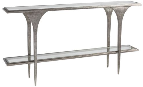 Hammered hand-forged contemporary iron base with a textured silver leaf in a silver finish, showing natural mill scale and forging marks. The console table features shaped legs, decorative lower shelf with inset gless, and a tempered glass top.Read More