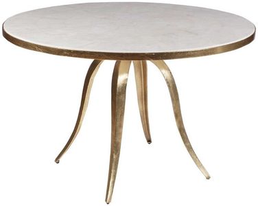 Hand-forged iron base in gold foil finish with inset veneered white crystal fossilized stone top. Perfect for gatherings, this table enhances dining spaces with its graceful presence, making every meal an elevated experience.Read More