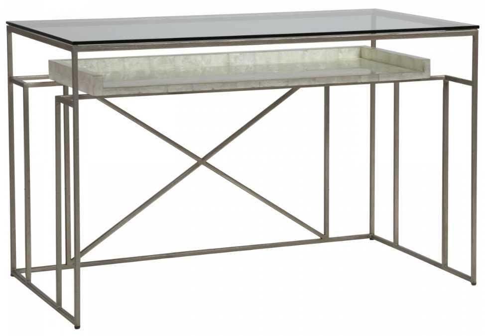 One of our most popular collections, we have added another finish option by pairing the champagne foil finished iron frames with capiz shell floating shelves. The writing surface for the desk is glass, creating a strikingly stunning silhouette.Read More