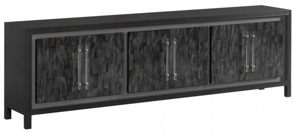Faux horn motif hand-painted by artists on individual resin tiles in a dark gray bone coloration with custom acrylic hardware and bright nickel finished clasps located on the six doors which hide six adjustable shelves and a ventilated back. Faux horn tiles will vary in appearance and coloration from piece to piece.Read More