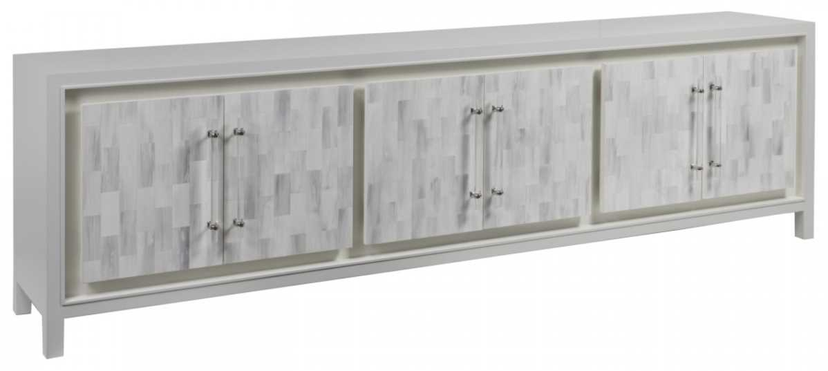 Faux horn motif hand-painted by artists on individual resin tiles in a light gray/white bone coloration with custom acrylic hardware and bright nickel finished clasps located on the six doors which hide six adjustable shelves and a ventilated back. Faux horn tiles will vary in appearance and coloration from piece to piece.Read More