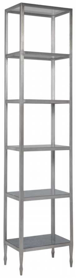 Light, airy design in a solid iron finished in antiqued silver leaf. The slender, shallow form has four lower tempered Eglomise glass shelves and two upper tempered clear glass shelves.Read More