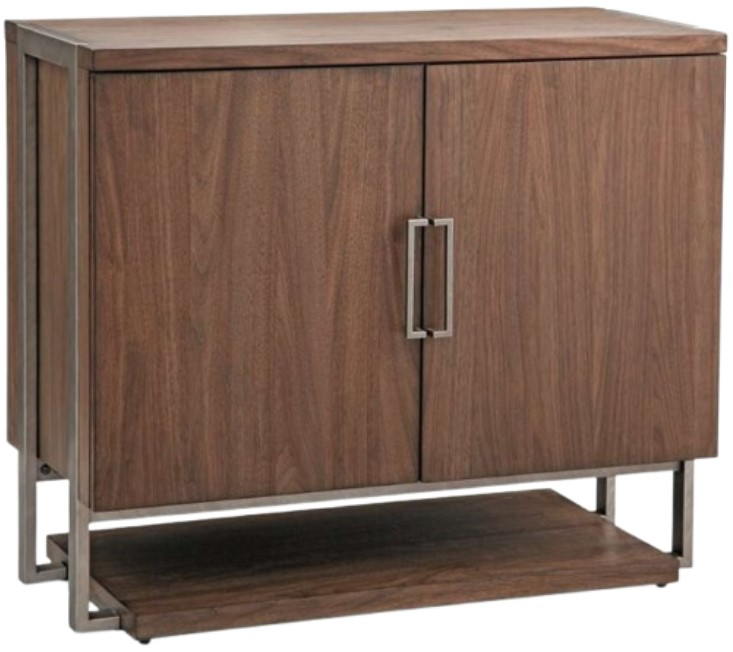 The Brooke cabinet features slick, modern styling with mid-century elements. Inset brushed metal frames and supports the brown knotty wood, two door cabinet above the lower exterior shelf. The doors open with brushed metal bar pulls revealing two adjustable shelves, stemware and bottle storage.Read More