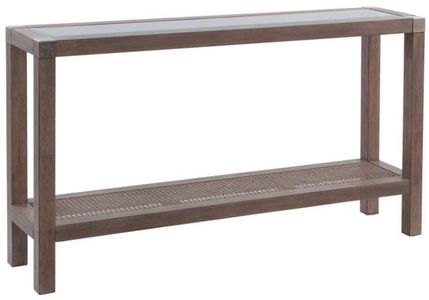 Introducing the Calum Console Table, inspired by coastal farmhouse aesthetics. Crafted from solid wirebrushed rubberwood, it features clear tempered glass inset tops and charming cane inserts in the base. The neutral driftwood finish, complemented by brushed nickel corner cap detailing, brings tranquility to your space.Read More