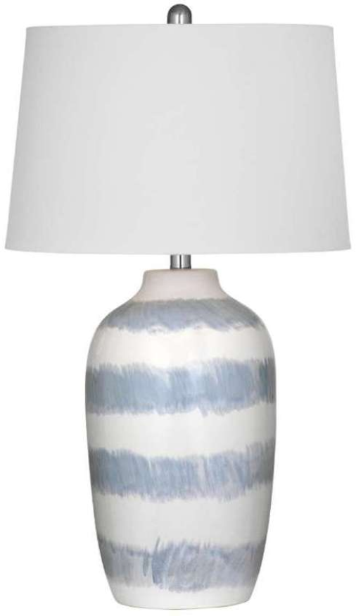 The Harper Table Lamp boasts a ceramic body with a visually soothing pattern of horizontal blue stripes, reminiscent of serene ocean waves or soft brushstrokes on canvas. This artistic element is capped with a simple white lampshade.Read More