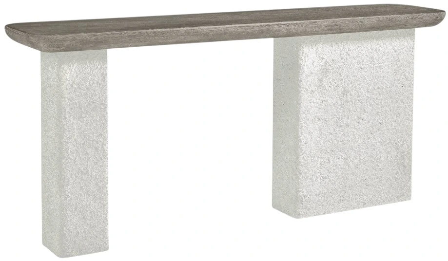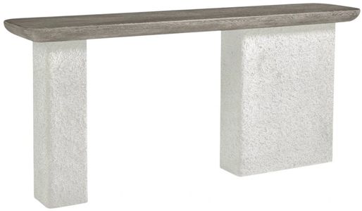 Inspired by bold architectural design, the Monolith console table is created with two structural columns in faux stone in Millstone finish. They support a wire-brushed oak top in Puma finish for a textural organic look.Read More