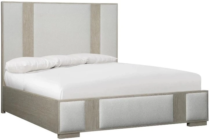 The Solaria panel bed combines the clean lines of minimalism with layers of texture in a tonal palette of natural hues. The headboard and footboard take on a geometric pattern with three inset upholstered panels and two wood vertical panels featuring quartered white oak veneers in a Dune finish.Read More