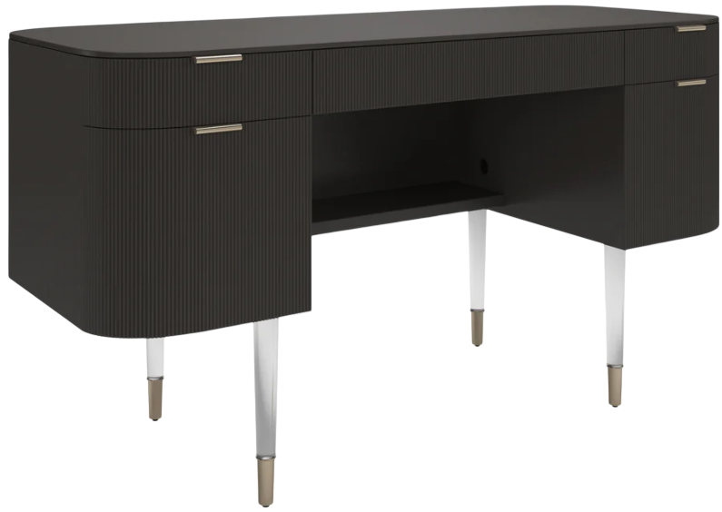 With a touch of femininity, its graceful design creates a place for everything and somewhere to keep everything in its place. Use it as a desk or dressing table—or both! Its rounded silhouette features fluted detailing highlighted in dark chocolate and touches of whisper of gold.Read More