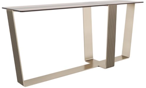 This console table features a smoked bronze glass top set on a sculptural brushed gold base. With its clean lines and elegant contrast of materials, it serves as a refined accent piece—ideal for entryways, hallways, or behind a sofa to elevate any interior space.Read More