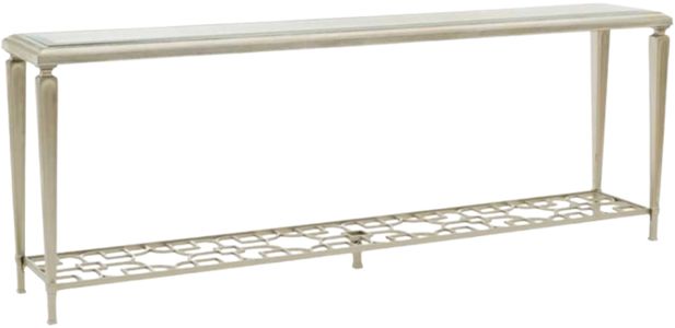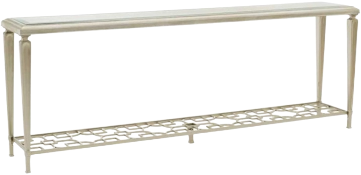 Open and alluring, this distinctive console table makes a bold statement. Its airy design is elegant in its simplicity and features an exquisite metal fret-patterned shelf that can be seen through its glass top. Tall metal legs reach skyward and support its clear glass top with 1.25 bevel.Read More