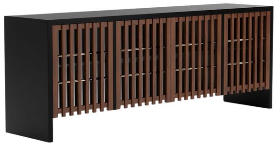 Functional yet striking, the Pinstripe Dark Sideboard features Smoked Bronze glass door panels behind Rich Walnut slats, framed in Dark Chocolate and accented with Champagne Gold rods. Adjustable shelves and integrated LED lighting deliver thoughtful luxury—storage with soul that becomes a luminous centerpiece.Read More