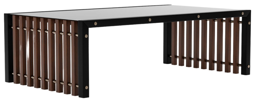 Lightness and structure in dialogue: the Pinstripe Dark cocktail table layers individually veneered Rich Walnut slats on all sides, pierced by Champagne Gold rods beneath a Smoked Bronze glass top. Airy, sculptural, and grounded by a Dark Chocolate frame—an architectural centerpiece for luxury living rooms.Read More