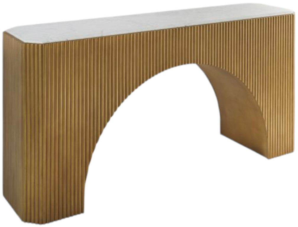 This striking console features a reeded, gold leaf finished base with a beveled edge, clipped corner, marble top that sets just inside the wood profile. Stunning in a foyer, it also works for extra serving space in a dining room.Read More