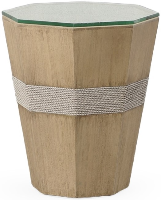 The Dunes spot table combines dyed grey lampacanay with the tan finished wood alternating. The design tapers smaller from top to floor. A glass top lays over the rope-detailed top.Read More