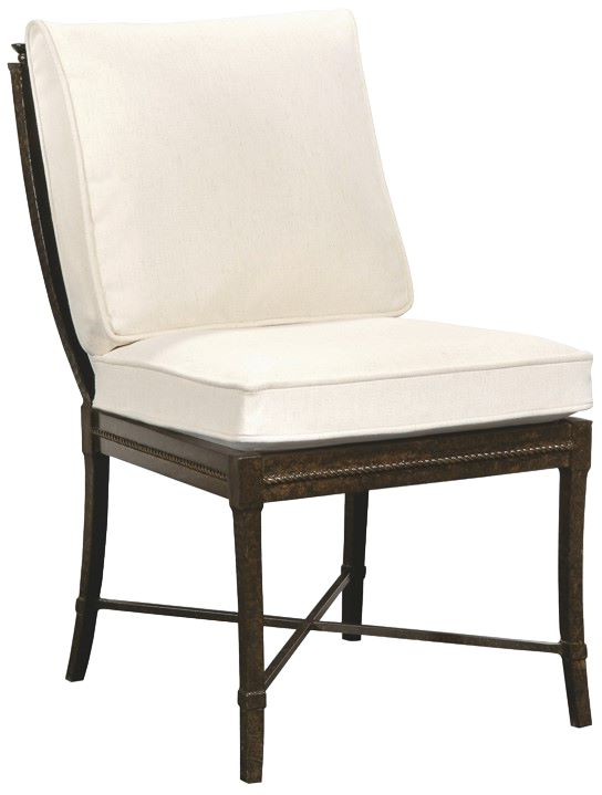 Classic Spanish-Mediterranean styling on our Dining Side chair. Saber detailing and decorative fob accents featured on all pieces. Sling fabric back is swagged into gondola-style design with decorative trim details. Sand-cast, aluminum frames feature a hand forged look of classic architectural ironwork and decorative balustrades.Read More