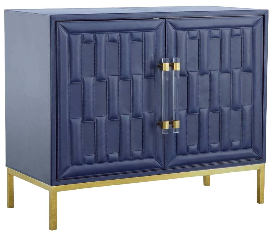 The Bowie chest is completely wrapped in navy leather and features Trapunto quilting on the doors. Two large acrylic pulls with brass accents and a satin brass base give this chest a sophisticated and polished finish. The interior is trimmed in suede and includes one adjustable shelf.Read More