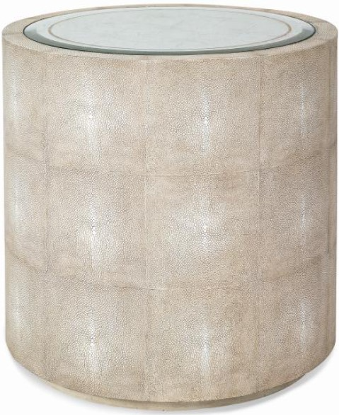 This transitional drum table is wrapped in cream and taupe-colored faux shagreen and topped with an eglomise inset top accented with antique gold stringing. The item itself provides compliments to other furniture surrounding it. Make a bold statement by incorporating this stunning furniture into your home.Read More