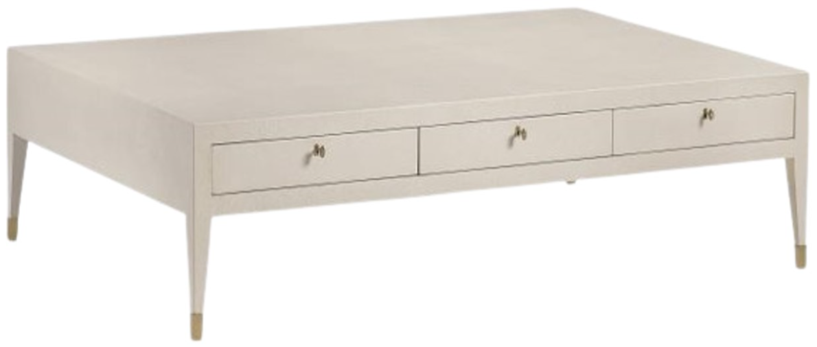 A traditional form wrapped in a striking faux shagreen leather transforming it into a more modern look that complements any interior style from traditional to contemporary. Features include delicate tapered legs with satin brass finish ferrules and three working drawers with a brass finished key and keyhole hardware.Read More