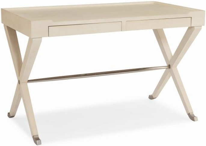 Our sophisticated little Metro Luxe writing desk has a randomly matched Chestnut Cluster veneer top that's bordered on three sides by a raised gallery edge. Its base features two pairs of X-shaped legs joined by a simple metal stretcher. The stretcher, along with the metal ferrules that cap each leg, has a nickel finish.Read More