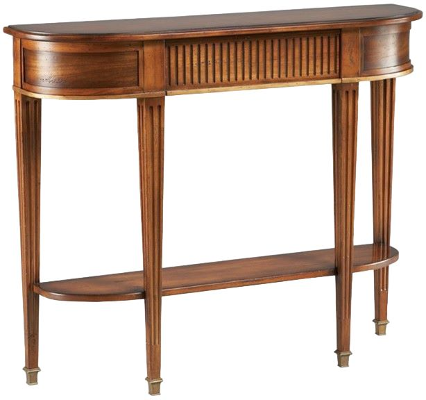 Elevate your home decor with the unmatched charm and quality craftsmanship. Demilune console with grooved center drawer front and shaped side aprons. Shaped lower shelf, grooved tapered legs with solid brass ferrules. Solid maple with cherry veneered top and shelf.Read More