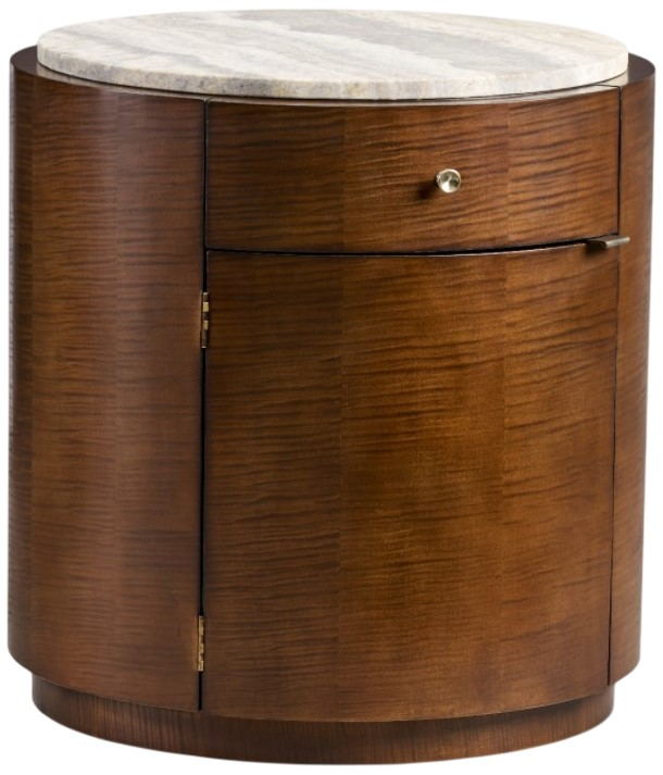 This large-scale drum table is wrapped in sycamore veneer that resembles an iridescent tiger stripe effect and is topped with a warm taupe, tan and soft gray marble top that stands proud of the base.Read More