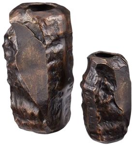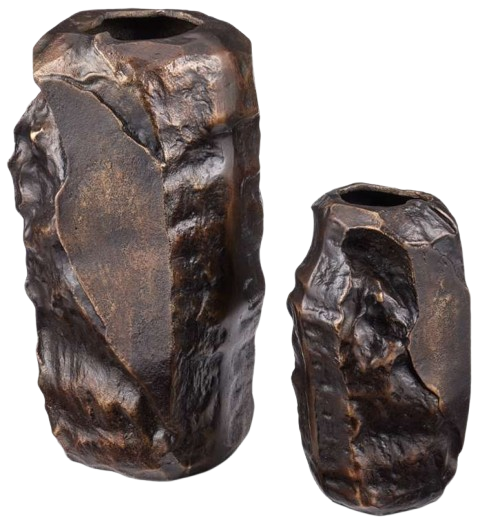 Brutalist in style, the Carmelo Vase Set includes two cast aluminum vessels in a scorched bronze finish that brings the surfaces a warm gleam. The organically shaped profiles look as if they were born during the famous time in design history when brutalism was at its height.Read More