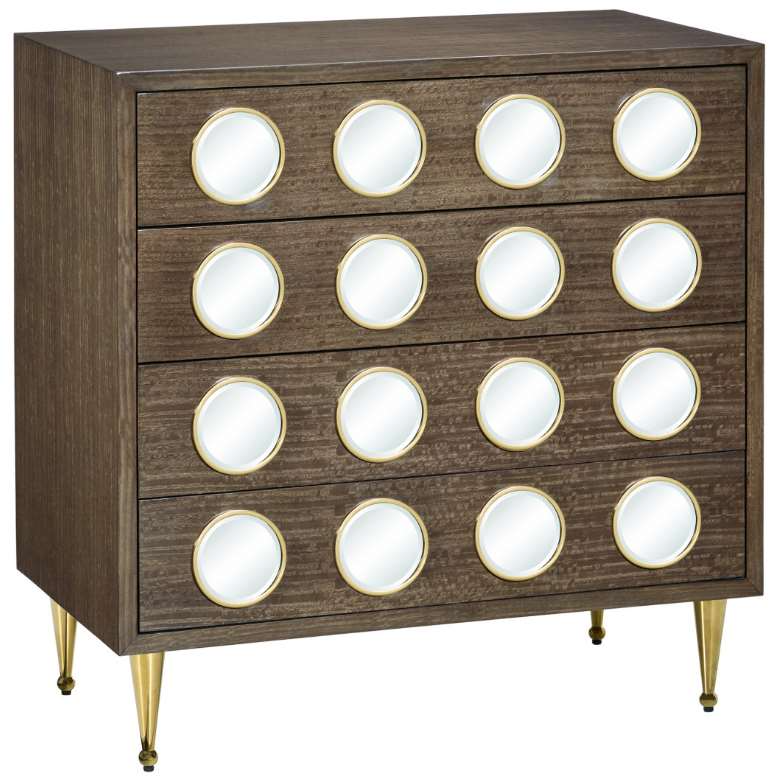 The luminous beveled mirror accents, which sit proud on the surface of the chest, are surrounded by stainless steel rings in a polished brass finish that to the legs.