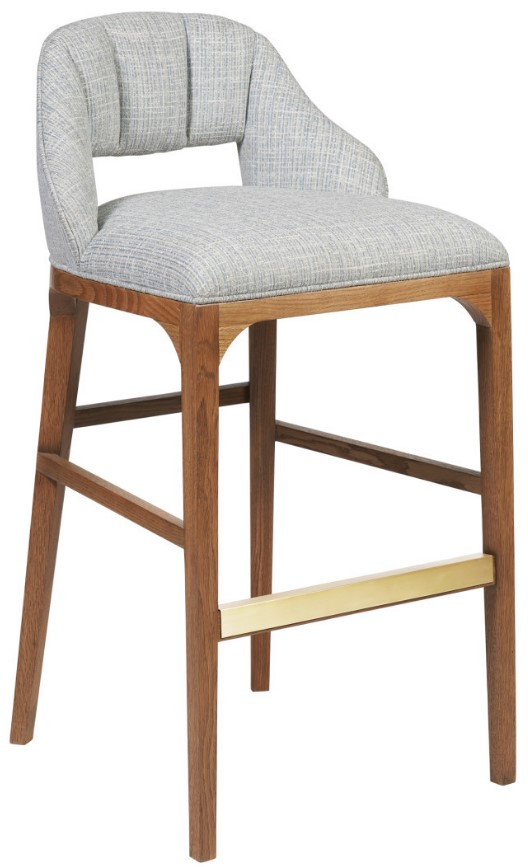 The Inga Bar Stool covered in a Greenlight Powder fabric has an upholstered back and seat that sits nimbly atop a solid oak frame in a morel brown finish. The paleness of the fabric and the warmth of the wood create a soft contrast.Read More