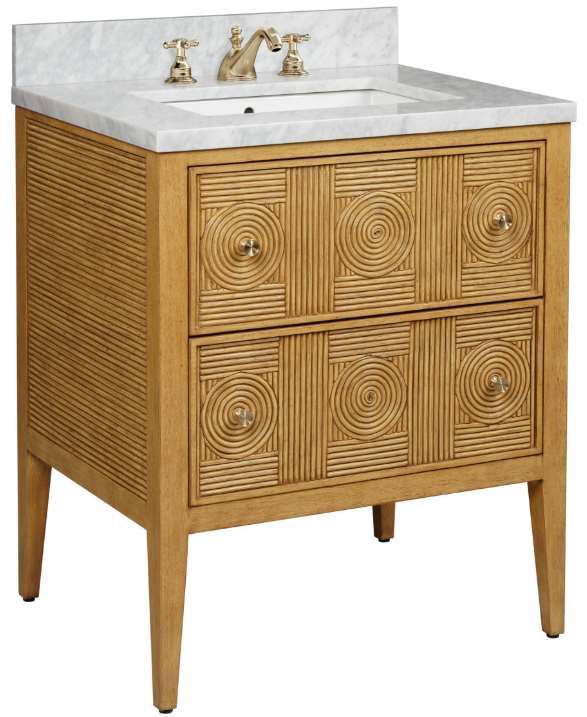 The Santos 28" Sea Sand Vanity has split rattan pattern on the drawers and sides made by hand and applied to a solid mahogany frame. Then a Sea Sand finish covers the entire piece. Two sets of pulls are included in brass and polished nickel finishes to allow some customization.Read More