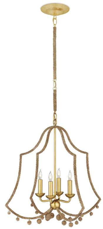 The frame, made of wrought iron in a contemporary gold leaf finish, is partially wrapped in natural Lampakanay rope, as are the tiny globes that hang beneath it.
