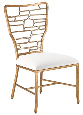 The open geometric framework with its irregularities and jagged edges on the back of the Vinton Muslin Chair suggests handcrafted iron work. In a gilt bronze finish, the wrought iron shimmers with a golden patina.Read More