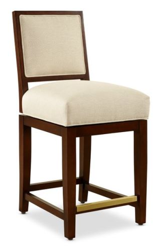 The Allendale stool is the Geneva stool frame with a beautiful fret back insert added to the outside back. The geometric circle fret design is delicate in scale having crisp lines and beautiful proportion. The fret part is made from cast resin that is finished to match the stool wood finish. The tightly upholstered back fabric placed behind the fret helps create a stage for the fret design to be clearly seen and appreciated. The rectangular seat is tightly upholstered. when looking at the back of the stool, you can see the exposed wood picture frame that surrounds inset upholstery. The back posts flow down from the bottom back rail and to the outer sides of the tightly upholstered seat. The seat attaches to the exposed wood stool base by a memory swivel. The exposed wood base has tapered legs that are stretchered. A metal kick plate, available in 3 finish choices, is glued to the front stretcher.Read More