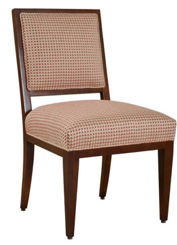 The Allendale chair is a variation on our Geneva exposed wood square back chair. This chair features a beautiful fret insert design on the outside back. The geometric circle fret design is delicate in scale having crisp lines and beautiful proportion. The fret part is made from cast resin and is finished to match the chair wood finish. The tightly upholstered back fabric placed behind the fret help to create a stage for the fret design to be clearly seen and appreciated. The inside back of the chair is tightly upholstered with a beautiful welt detail that surrounds the upholstery. The tightly upholstered seat is framed by exposed wood seat rails on all four sides. Tapered leg posts flow down from the exposed wood seat rails to the floor.Read More