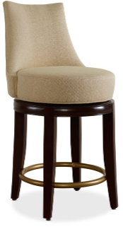 The Amherst swivel dining stool has a modern feel with its smooth, rounded back that gracefully tapers up from the round seat. The top rail has movement both in its curved shaped and in its slightly dipped center. Welt trim accentuates the overall shape of the back. The tightly upholstered round seat attaches to the base by memory swivel. The round, exposed wood base with tapered legs and metal foot ring completes the sleek, clean look of this stool. The metal foot ring is available in three color choices – Brass, Bronze and Satin Nickel.Read More