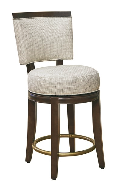 The Arlington swivel dining stool is the matching stool to our Arlington dining chair. Like the chair, this stool is transitional in style and features a beautiful exposed wood top rail that is curved. The wood rail frames the inset upholstery on both the inside and outside back. The back is open between the bottom of the back panel and the seat. Vertical wood back posts attach to the back of the tightly upholstered round seat. The seat part attaches to the round, exposed wood base by memory swivel. The rounded top rails of the exposed wood base have beaded edge work on both the top and the bottom. Tapered legs flow gracefully to the floor. A metal foot ring (available in three finish choices), completes this exquisite stool.Read More